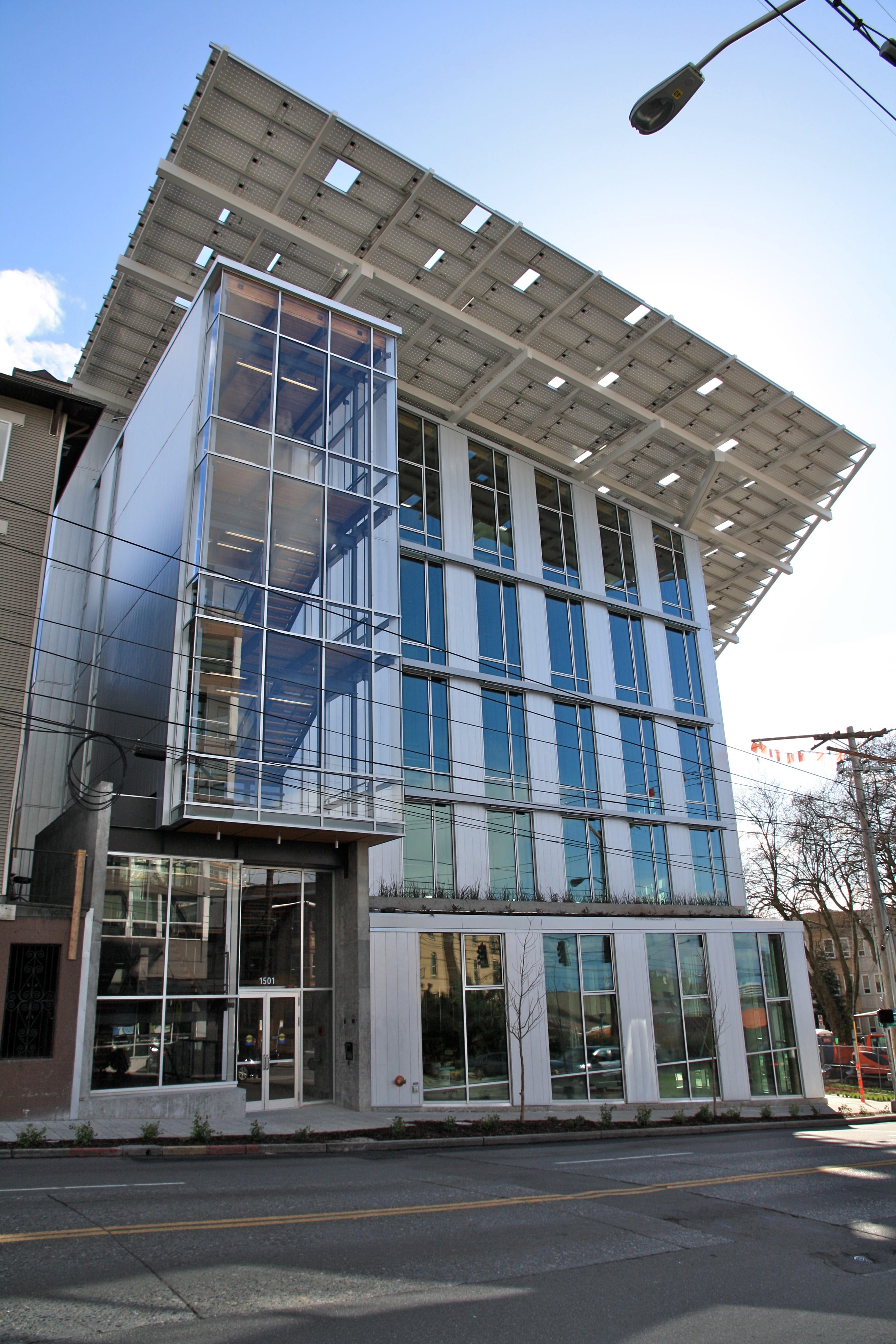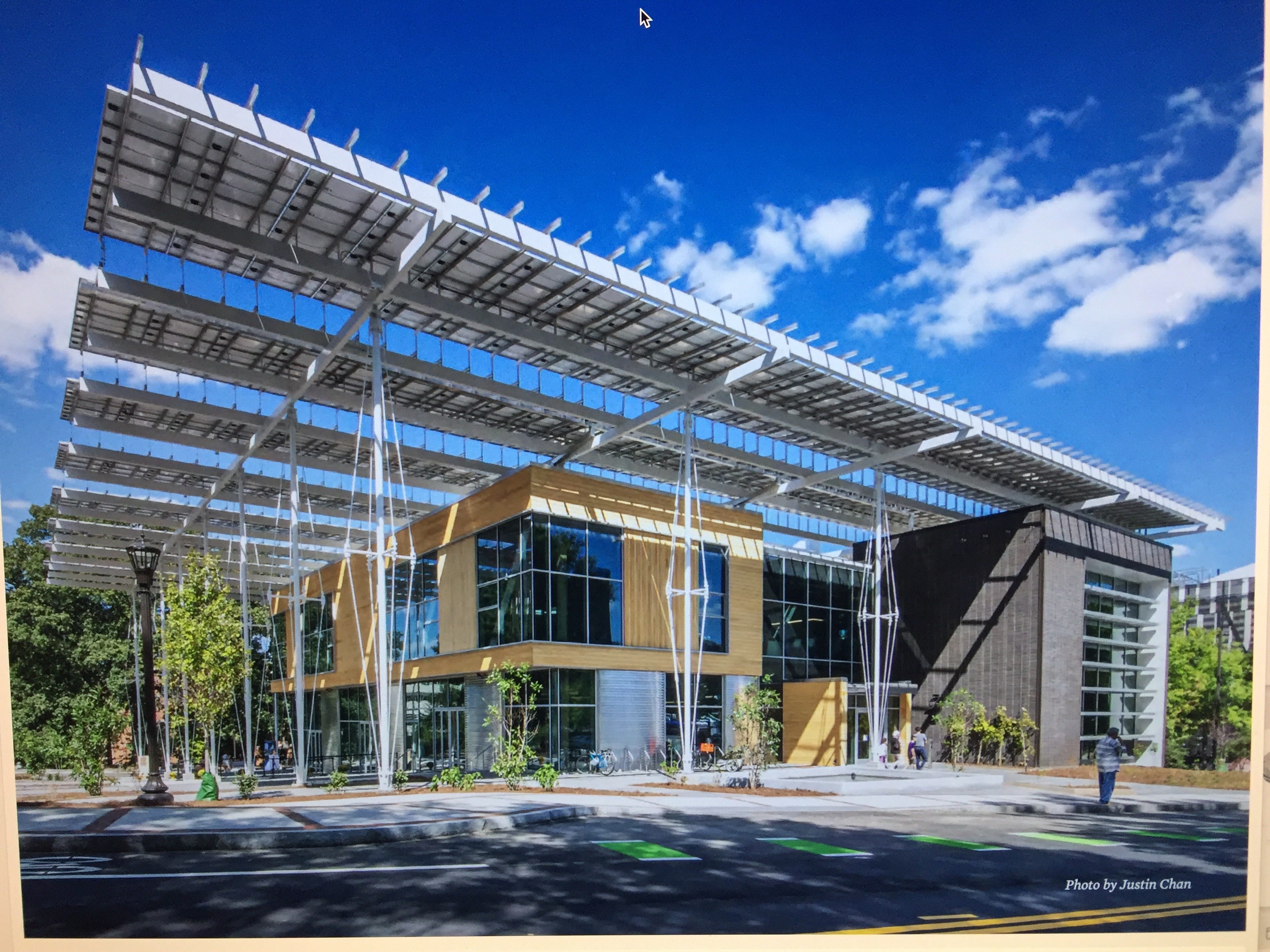 The same team brought its low-energy acumen to the Kendeda Building for Innovative and Sustainable Design at Georgia Tech. Working with local architect Lord Aeck Sargent the building bears little resemblance to Bullitt because it is attuned to Atlanta’s heat and humidity. It features a huge overhanging roof that deflects unwanted solar heat, as well as providing convivial shade in the Southern porch tradition. The design includes many tactics that reduce energy but the broad roof also hosts a massive solar array, producing 120 percent of the energy the building consumes.